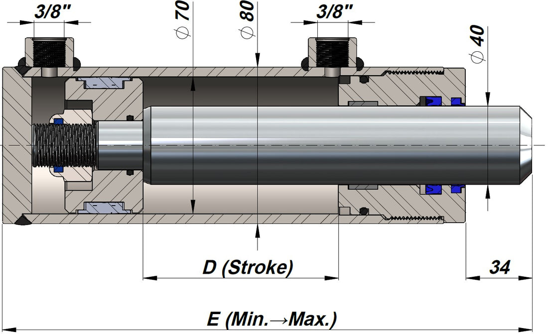 Hydraulikcylinderen er drejet ud af et honet stålrør. Røret, der er bearbejdet indvendigt, er lavet af materialet S235 JR. Stempelstangen er hårdkrombelagt, ligesom stempletænderne. Denne specielle overfladebehandling gør stålet glat og reducerer dermed tætningens slid til et minimum. Denne type krombelægning øger også modstanden betydeligt. Dette gør det også muligt for os at garantere en lang levetid på grund af korrosionsbeskyttelsen. Den tryk- og trækstyrke, vi angiver, er specificeret ved et driftstryk på 2610 PSI / 180 bar. Du kan også belaste den op til et toptryk på 3335 PSI / 230 bar.