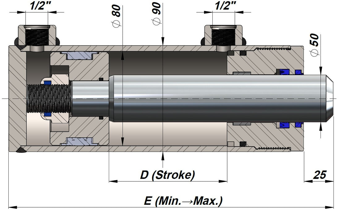 Hydraulisylinteri on valmistettu honotusta teräsputkesta. Putken sisäpinta on valmistettu materiaalista S235 JR. Mäntätanko on kovakromattu, samoin kuin männän leuat. Tämä erityinen pintakäsittely tekee teräksestä sileän ja vähentää näin tiivisteen kulumista minimiin. Tämän tyyppinen kromaus lisää myös merkittävästi kestävyyttä. Tämä mahdollistaa myös pitkän käyttöiän takaamisen korroosiosuojauksen ansiosta. Meidän ilmoittama puristus- ja vetovoima on määritelty käyttöpainetta 2610 PSI / 180 bar vasten. Voit myös kuormittaa sitä huippupaineeseen 3335 PSI / 230 bar.