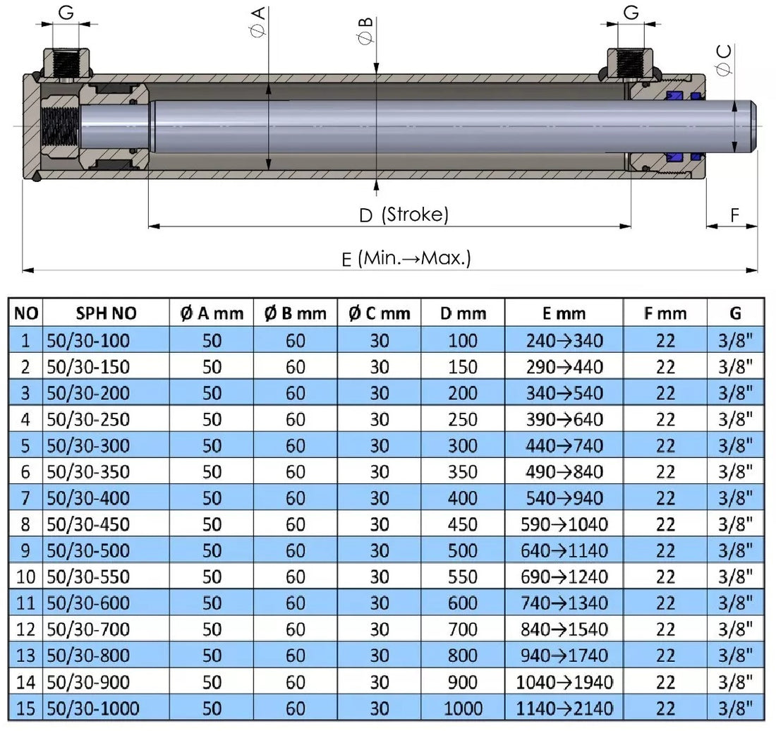 Le vérin hydraulique est fabriqué à partir d'un tube en acier rectifié. Le tube usiné de l'intérieur est en matériau S235 JR. La tige de piston a été chromée dure, tout comme les mâchoires de piston. Ce traitement de surface spécial rend l'acier lisse et réduit ainsi l'usure des joints au minimum. Ce type de chromage augmente également considérablement la résistance. Cela nous permet également de garantir une longue durée de vie grâce à la protection contre la corrosion. La force de compression et de traction que nous spécifions est indiquée à une pression de fonctionnement de 180 bars. Vous pouvez également le charger jusqu'à une pression de pointe de 230 bars.