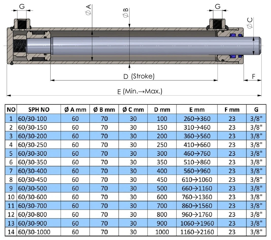Le vérin hydraulique est fabriqué à partir d'un tube en acier rectifié. Le tube usiné de l'intérieur est en matériau S235 JR. La tige de piston a été chromée dure, tout comme les mâchoires de piston. Ce traitement de surface spécial rend l'acier lisse et réduit ainsi l'usure des joints au minimum. Ce type de chromage augmente également considérablement la résistance. Cela nous permet également de garantir une longue durée de vie grâce à la protection contre la corrosion. La force de compression et de traction que nous spécifions est indiquée à une pression de fonctionnement de 180 bars. Vous pouvez également le charger jusqu'à une pression de pointe de 230 bars.