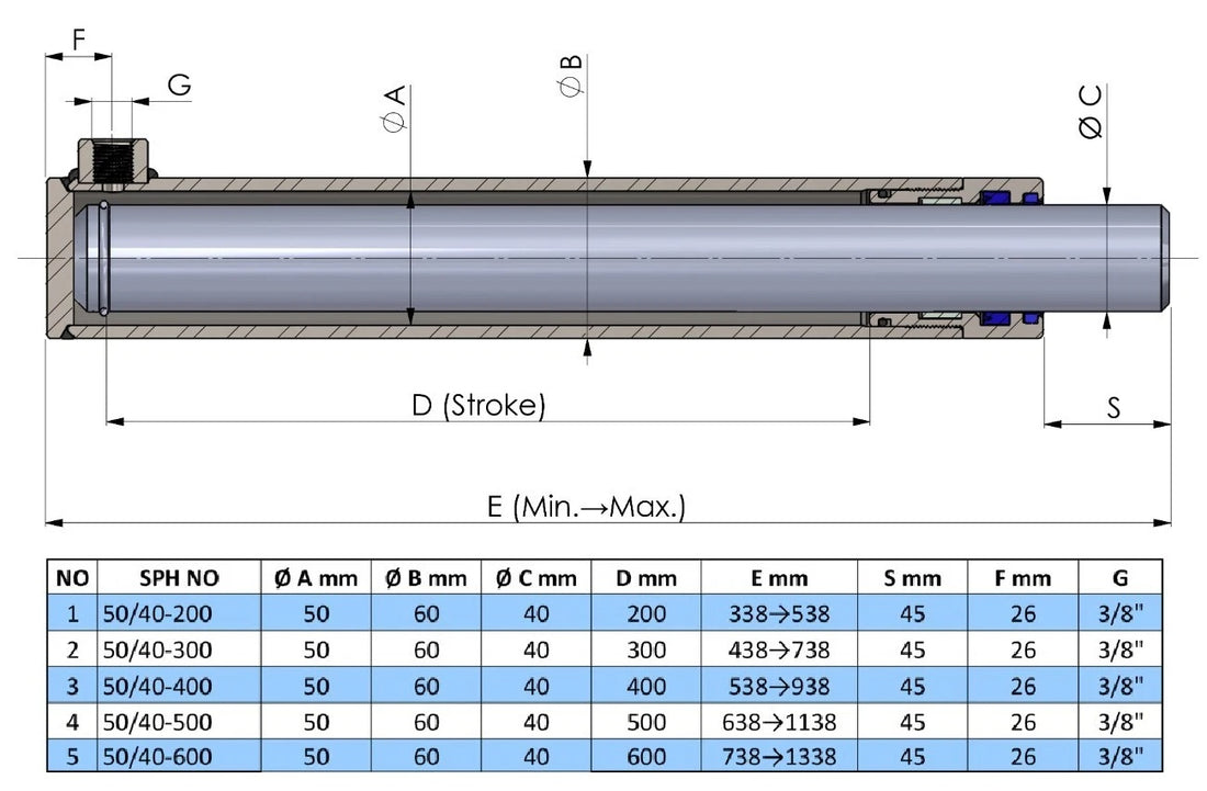Vérin hydraulique standard à simple effet. Ports de 3/8". Diamètre du piston et de la tige sélectionnable. Course sélectionnable.