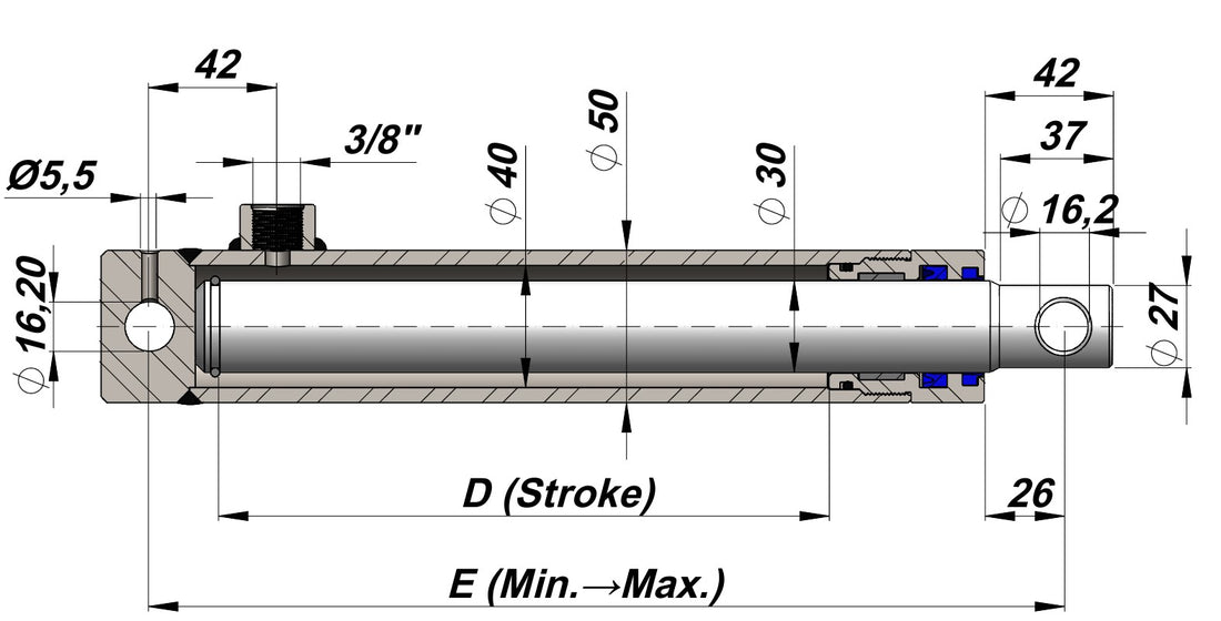 Hydraulcylinder enkelverkande med ändpluggshål. 3/8" portar. Kolv, stångdiameter och slaglängd valbara!