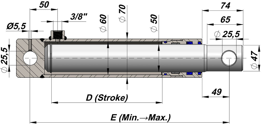 Hydraulcylinder enkelverkande med ändpluggshål. 3/8" portar. Kolv, stångdiameter och slaglängd valbara!